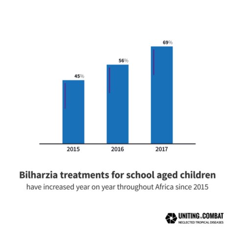 Schistosomiasis, also known as Bilharzia, has seen an huge increase in number of treatments and coverage in the African region. From treating 45% of school-aged children in 2015 to reaching and treating 69% in 2017. The minimum goal is to reach 75% of all school-aged children by 2020. But we want all communities living at risk of schistosomiasis to be treated, only then can we move to the elimination of schistosomiasis!
