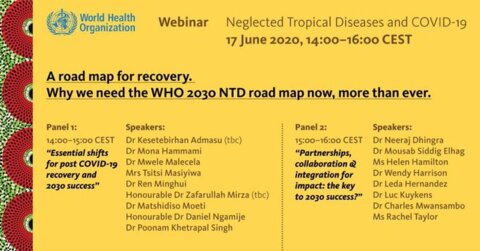 "WHO is organizing a webinar to discuss the new NTD road map and the impact of the pandemic on global NTD programmes. This inaugural webinar, which will be succeeded by seven others, will also discuss implementation of prevention, control, elimination and eradication programmes in a changing NTD landscape and the adjustments needed to adapt to the new normal."