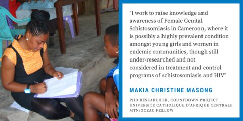Ms Makia Christine Masong's background is in Sociology and Anthropology. She is a PhD candidate at the Université Catholique d'Afrique Centrale, sponsored by the project MTN - "Lutte contre les maladies tropicales négligées en Afrique Centrale" of the OCEAC (Organisation of Coordination for the Fight against Endemic Diseases in Central Africa). Her research, through projects like COUNTDOWN, is on the perceptions and treatment seeking behaviours linked to symptoms of Female Genital Schistosomiasis (FGS).