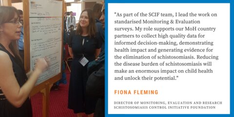 Dr Fiona Fleming is the Director of Monitoring, Evaluation and Operational Research at the Schistosomiasis Control Initiative Foundation. Fiona supports SCIF partner countries design and implement standardised M&E surveys enabling countries to collect high quality data for informed decision-making, demonstrating health impact and generating evidence for the elimination of schistosomiasis. Fiona is the chair of the GSA Monitoring and Evaluation Working Group.