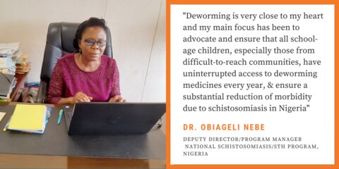 Dr Obiageli Nebe is the Deputy Director/Programme Manager of the National Schistosomiasis/STH programme of Nigeria. She has long-standing experience in the public health sector, with expertise in the control and elimination of schistosomiasis and soil-transmitted helminthiasis. Dr Nebe is working to substantially reduce the morbidity due to schistosomiasis in Nigeria, inline with the health sector reforms and the new WHO NTD 2030 Roadmap. Read this NTD NGO Network Interview of Dr Nebe on cross-sector collaboration to Beat NTDs.