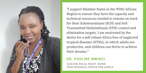 Dr Pauline Mwinzi works for the WHO African Regional Office on the Expanded Special Project for the Elimination of Neglected Tropical Diseases (ESPEN). She is the focal point for Schistosomiasis and Soil-Transmitted Helminthes, supporting Member States with their SCH/STH disease intervention programmes.Check out the ESPEN portal here.
