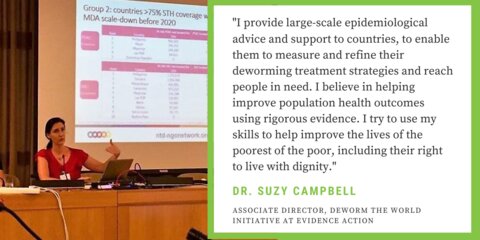 Dr Suzy Campbell is the Associate Director of the Deworm the World Initiative of Evidence Action. Dr Campbell uses her extensive background in epidemiology to support parnter countries design their interventions strategies and collect data to evaluate the impact and success of the deworming programmes. Suzy is a member of the GSA Monitoring and Evaluation Working Group.
