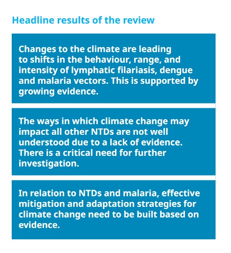 The complex and diverse nature of NTDs and malaria, coupled with major research gaps, has led to this urgent call for multidisciplinary efforts to predict, prepare and respond to evolving epidemiological patterns under climate change.