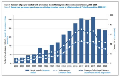 "Globally, 75.3 million people received treatment for schistosomiasis in 2021, for a total coverage of 29.9%; 94% of all treatment delivered globally was in the African Region. The low coverage was due mainly to control measures for the COVID-19 pandemic, which resulted in suspension of PC in many countries and endemic areas. Some countries (Uganda and Zimbabwe) that have large numbers of people who require PC for schistosomiasis did not implement PC in 2021, while another (Madagascar) submitted a report, which is being reviewed. When these data become available, the number of treatments may show some increase in global coverage in 2021. Equatorial Guinea and South Africa have not yet started PC for schistosomiasis.